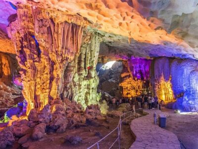 - Quý khách ra bến lên tàu, tham quan Vịnh Hạ Long – Di sản thiên nhiên thế giới được UNESSCO công nhận năm 1994, chiêm ngưỡng vẻ đẹp huyền bí của hàng ngàn đảo đá và các hang động kì thú: Động Thiên Cung, hang Đầu Gỗ…ngắm cảnh Làng Chài, hòn Ấm, hòn Rùa, hòn Đỉnh Hương, hòn Chó Đá, hòn Gà Chọi…