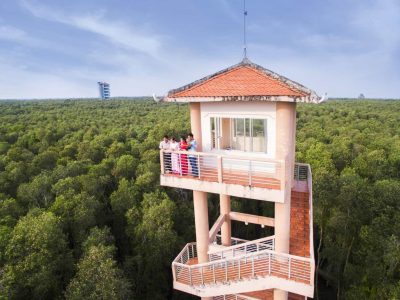 – Tháp quan sát với chiều cao lên tới 18m tận hưởng làn gió mát, chiêm ngưỡng toàn cảnh rừng tràm tại Làng nổi Tân Lập.