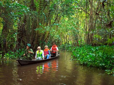 Sau khi thưởng thức bữa trưa với các món đặc sản địa phương, hành trình tiếp tục với chuyến tham quan Khu di tích Xẻo Quýt – một căn cứ cách mạng của tỉnh ủy Đồng Tháp trong thời kỳ kháng chiến chống Mỹ. Quý khách có thể chọn đi bộ hoặc ngồi xuồng ba lá để khám phá khu vực này, nơi bảo tồn gần 180 loài thực vật và hơn 200 loài động vật, bao gồm cả những loài quý hiếm.